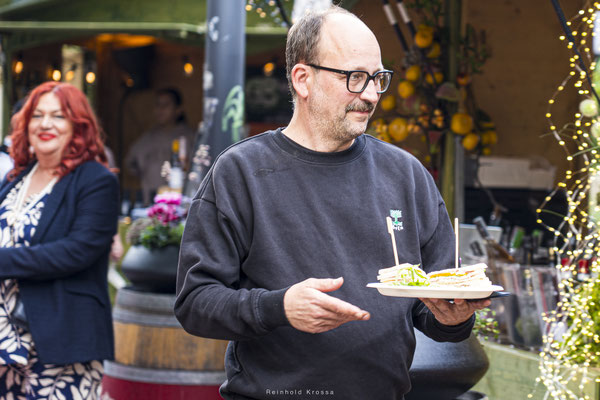 „Erstmals können auch sämtliche Beteiligten weinbegleitende Speisen anbieten“, so Klug. Zur Auswahl stehen etwa vom SSV Buer zubereitete Pommes, Currywurst und Bratwurst, italienisches Fingerfood von Lounge 1, vegane Häppchen von Juut und Tramezzini (Kiezliebe).